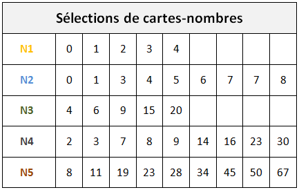 o Tirage de 3 Ã 5 cartes-nombres